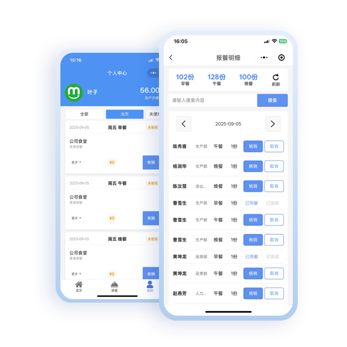 食堂管理员可实时查看旱中晚餐预定总数,便于准确备餐可按日期、姓名查询员工订餐情况,可单个订单操作