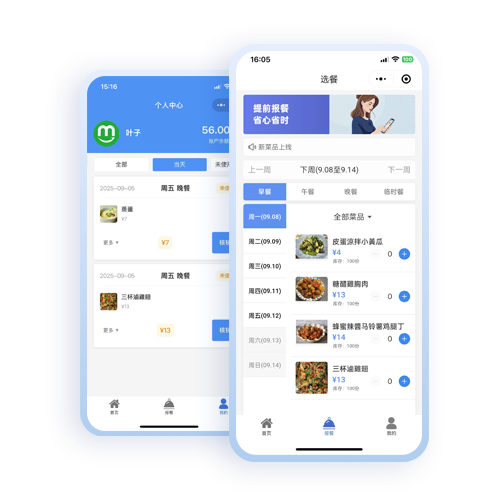 报餐小程序首页员工可选择日期、餐型、每餐食堂供应的菜品,截止预定时间等,预定成功后个人中心显示核销二维码